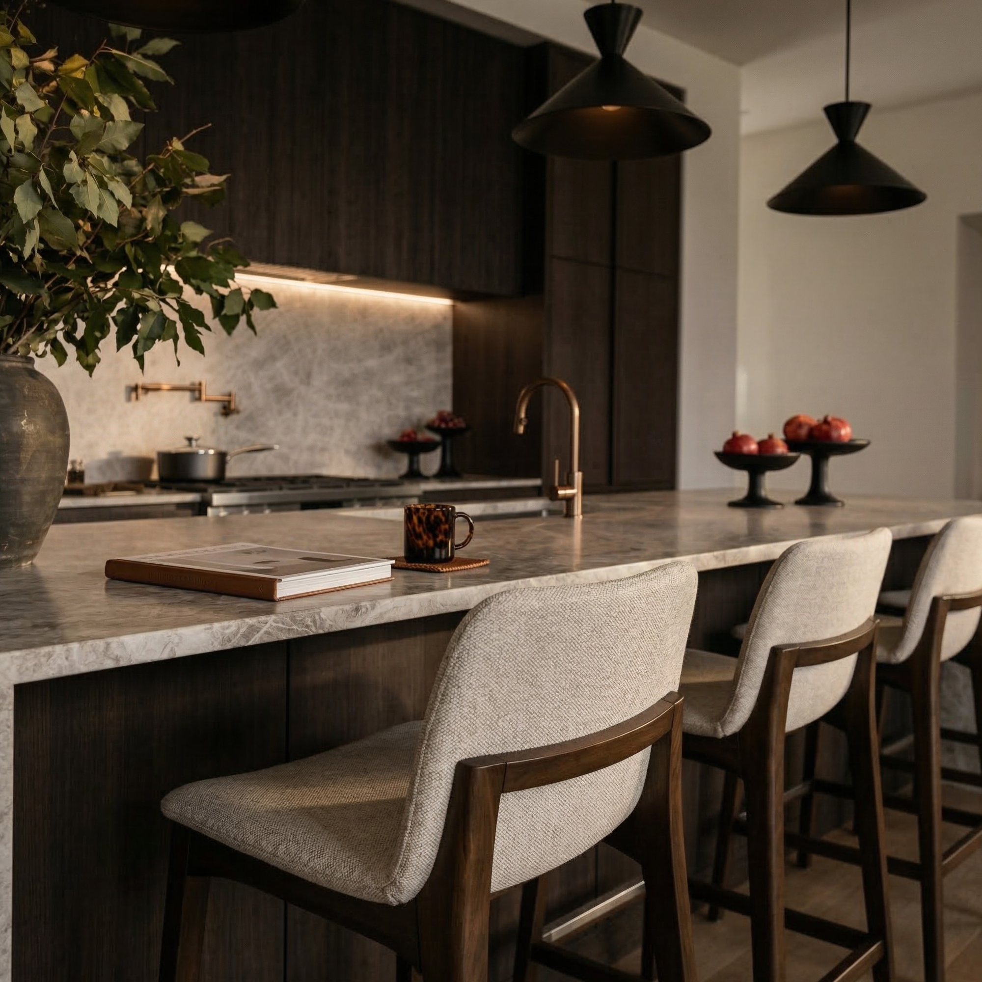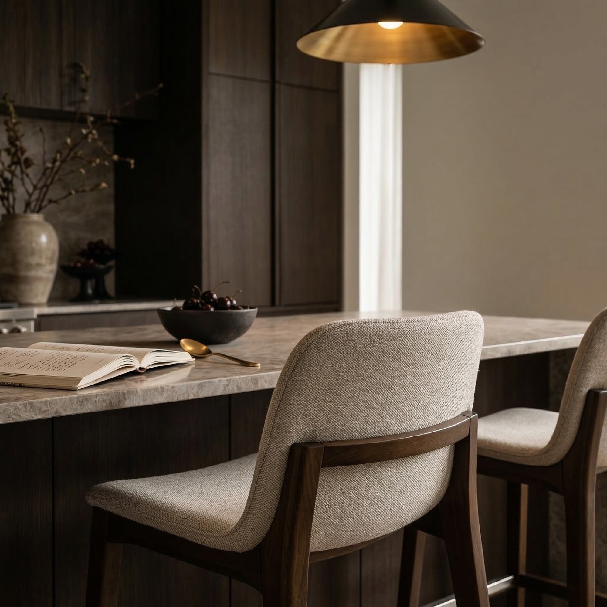 The Anita Fabric Barstool combines elegance and functionality with its refined design. It features a gently curved backrest and seat, upholstered in a soft, textured fabric for a comfortable seating experience. Available in two versatile fabric colours, Light Grey and Taupe, this barstool complements a variety of modern and transitional interiors. The stool is supported by walnut-finished legs, adding warmth and sophistication to its aesthetic. A polished Yulica footrest provides added support and durability, ensuring a practical yet stylish detail. Perfect for kitchen counters or bar areas, the Anita Barstool seamlessly blends comfort and design in any space.
