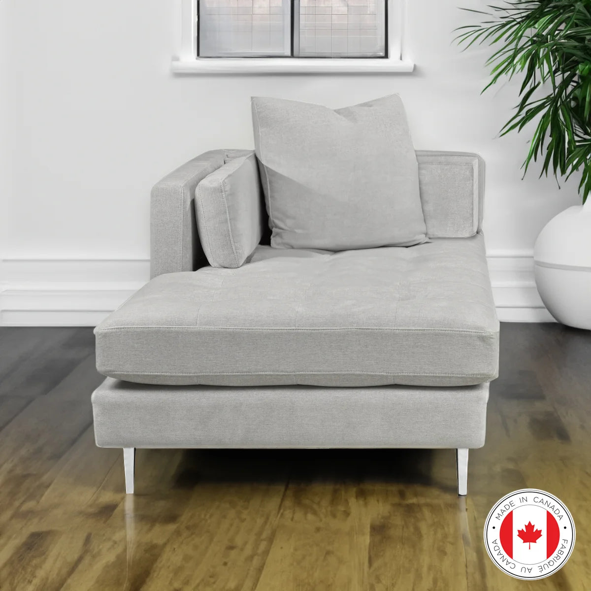 La chaise longue Bergamo offre le mélange ultime de style et de détente, conçue pour rehausser n'importe quel espace de vie. Disponible en version orientée vers la gauche ou vers la droite, elle est dotée d'une housse en tissu chic et performant qui résiste aux éclaboussures et aux taches (sauf le motif Monet). Le cadre en bois massif est vissé et collé de manière experte pour une stabilité accrue, tandis que la construction à ressorts sans affaissement assure un confort durable. Les pieds en acier poli et un coussin d'assise magnifiquement touffeté apportent une élégance moderne, complétés par deux coussins en duvet et un coussin décoratif pour plus de luxe. La chaise longue Bergamo est une pièce raffinée et élégante, parfaite pour une détente sophistiquée.