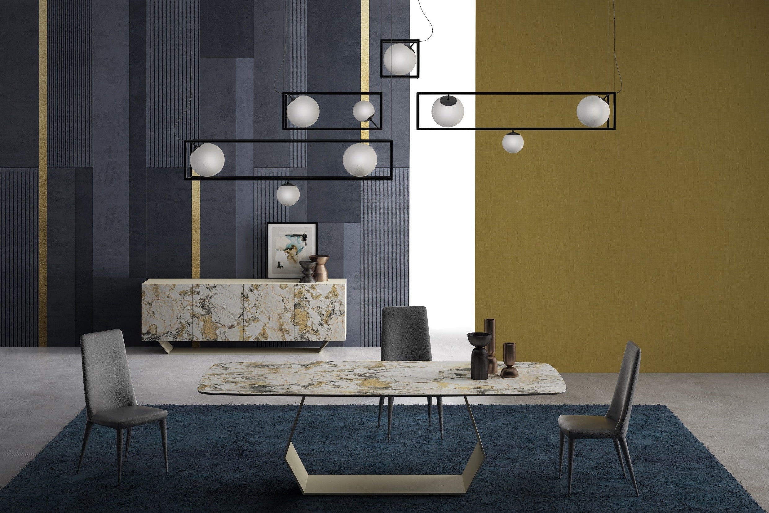 The Ibiza Dining Table features a stunning ceramic top and a pearl champagne metal base. This exquisite table elevates any dining experience, whether casual or formal, and is sure to spark conversation with its unique design.