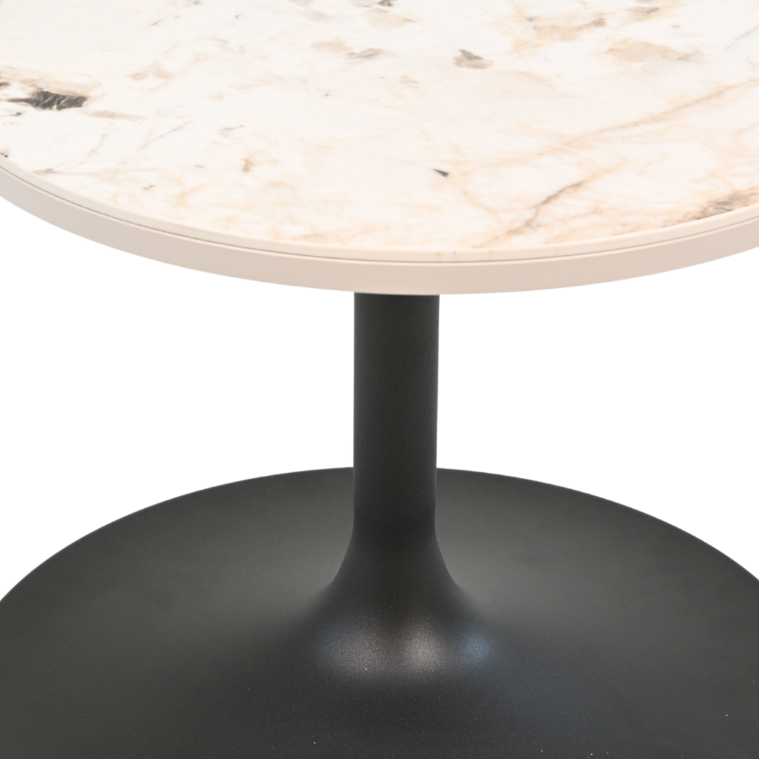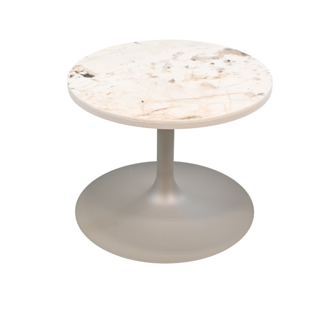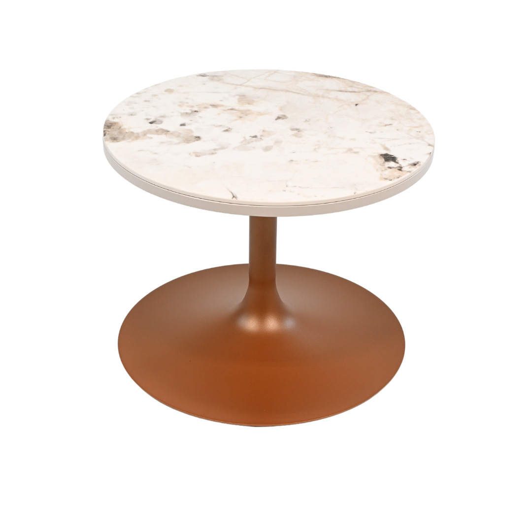 La table basse Marisa est dotée d'un plateau de 18 pouces de diamètre, fabriqué dans l'élégante finition Patagonia K28.
