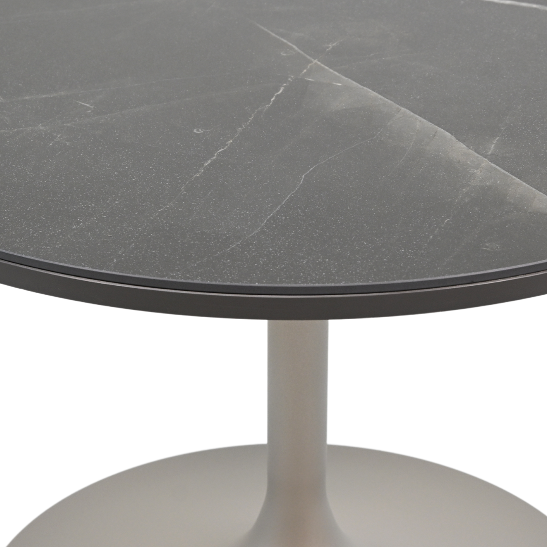 La table basse Marisa est dotée d'un plateau de 24 pouces en noir Calacatta, offrant un design élégant et épuré.