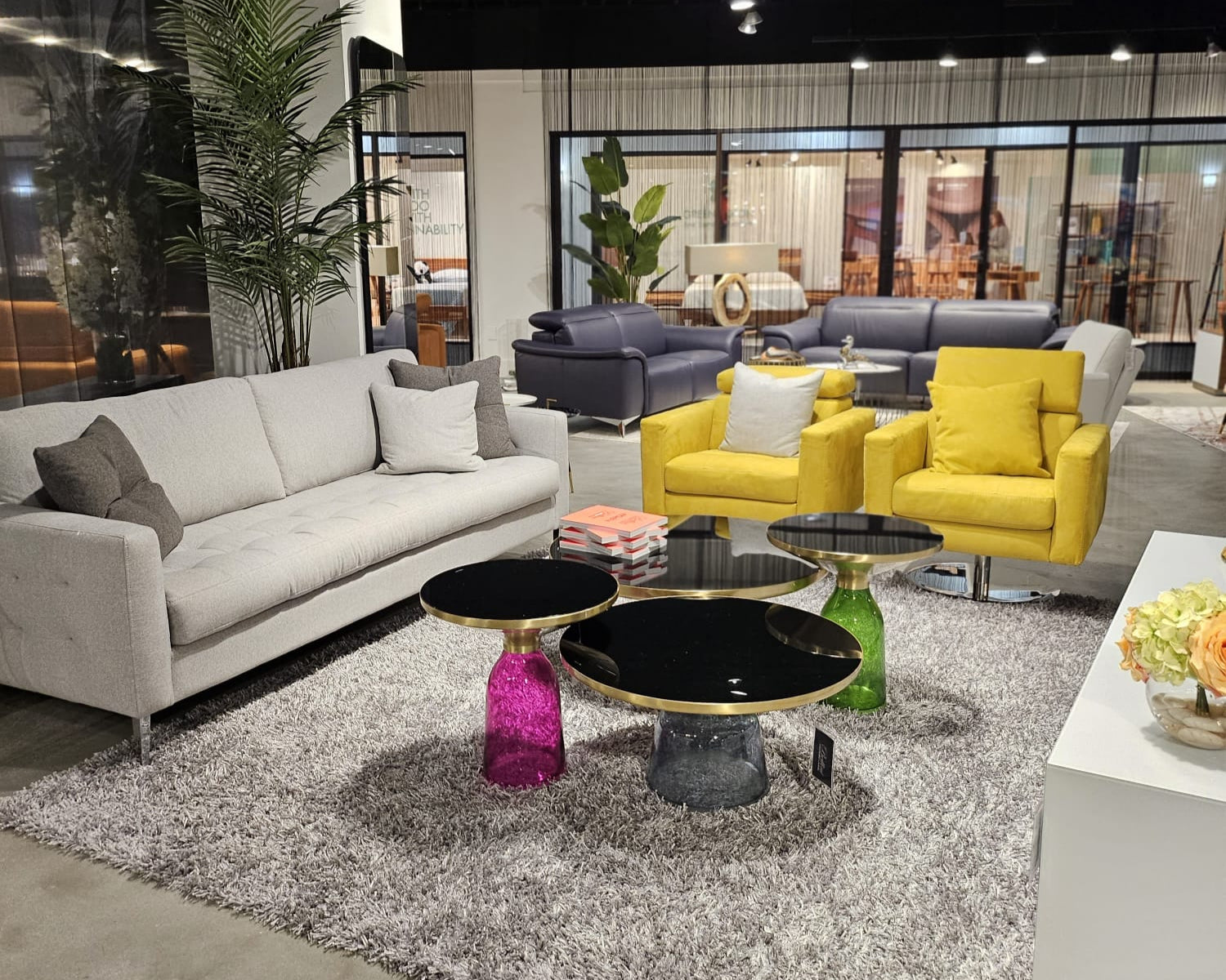 The Ritz End Table, available in a Dark Blue and Orange base, features a sleek black glass top. Complemented by a brushed gold stainless steel frame, it is a unique and colourful piece for your space.