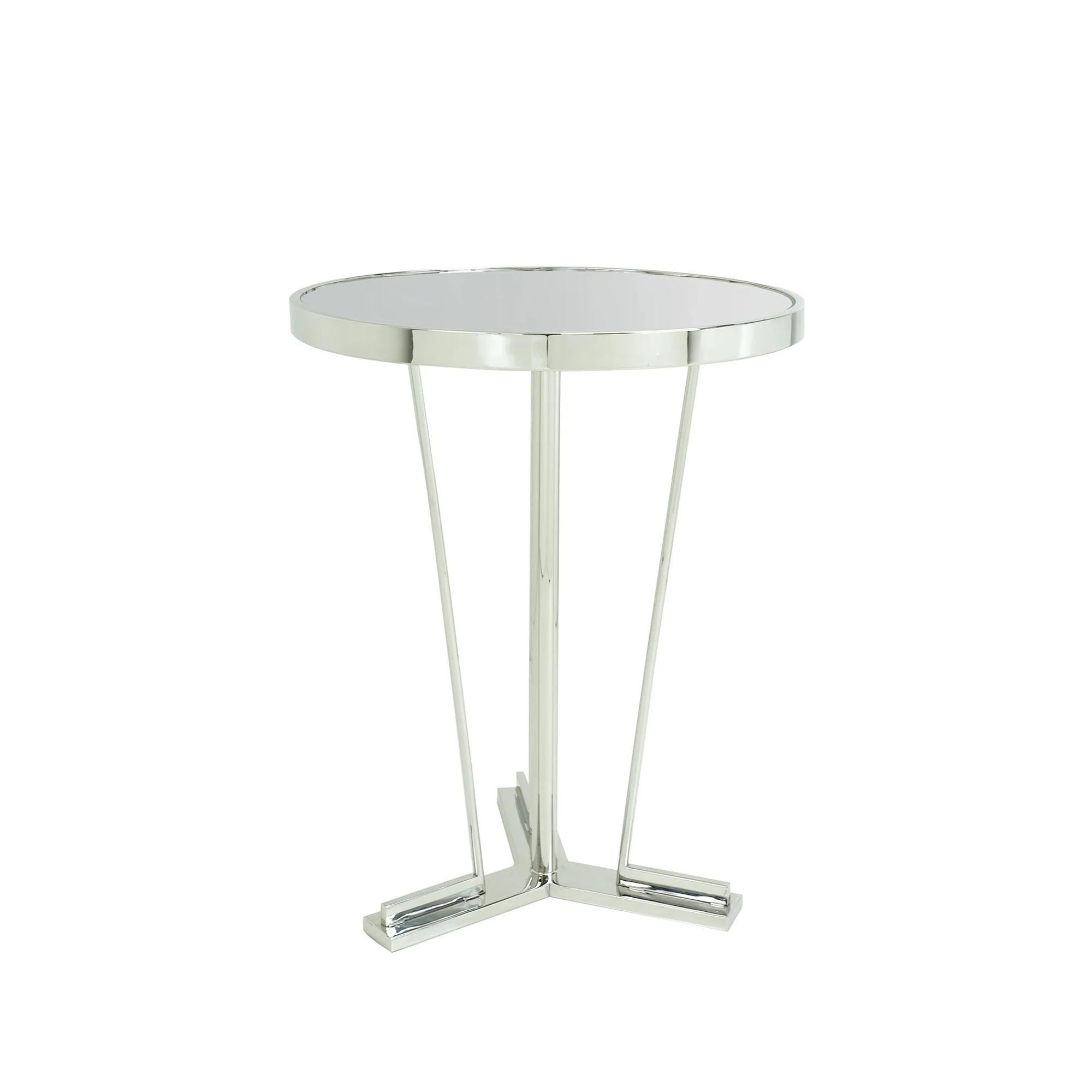 La table d'appoint Verti est dotée d'un plateau en miroir et de pieds en acier inoxydable poli, mesurant L 18" x L 18" x H 23".