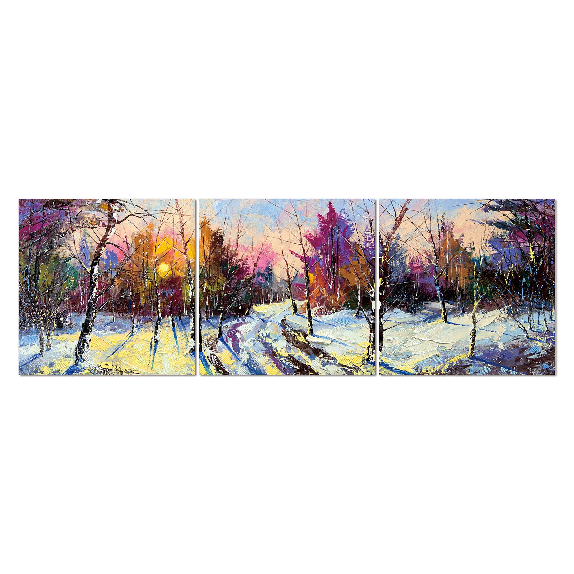 Questo pannello acrilico composto da 3 pezzi raffigurante "Foresta innevata" cattura magnificamente l'essenza serena e tranquilla di un bosco innevato.