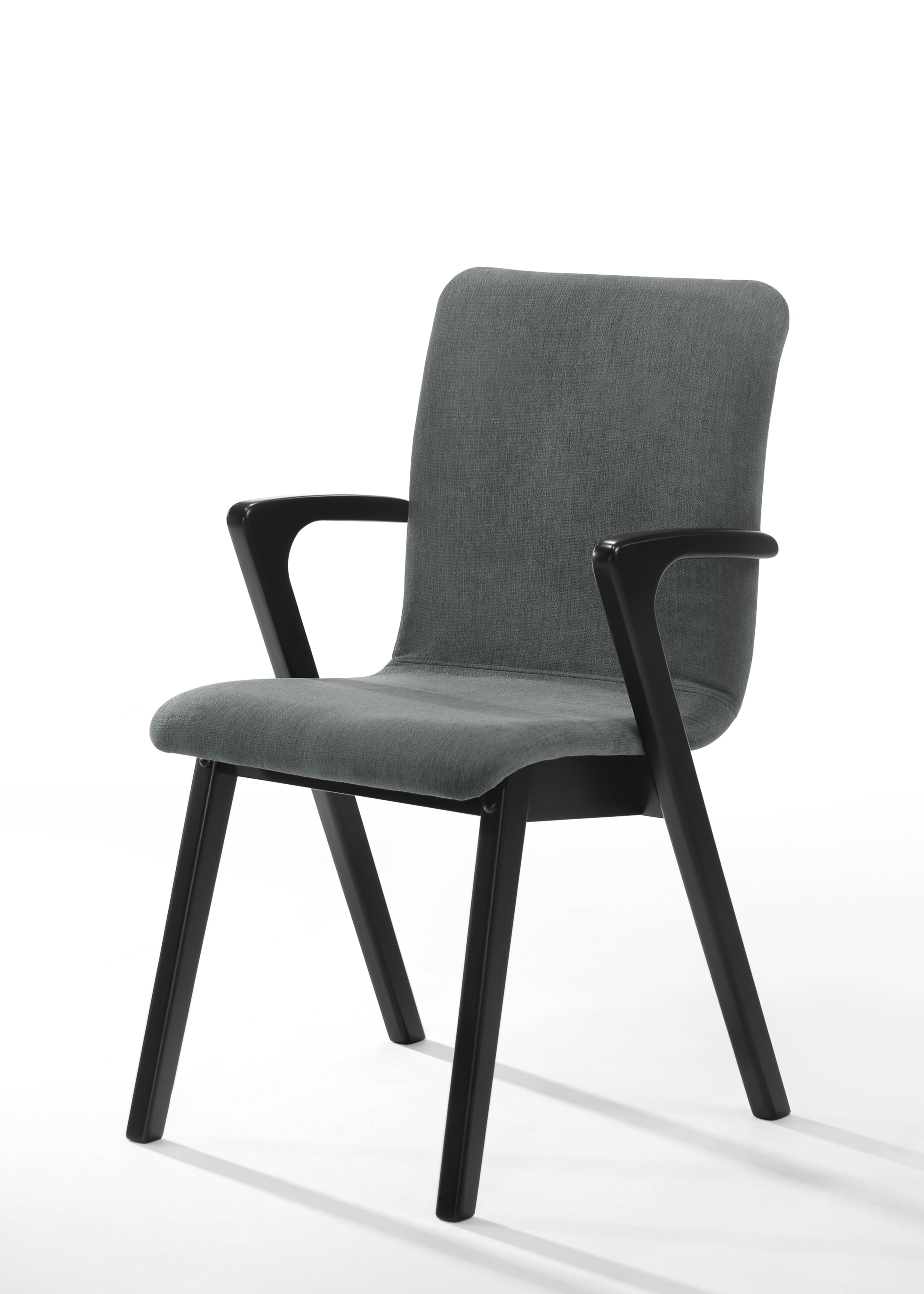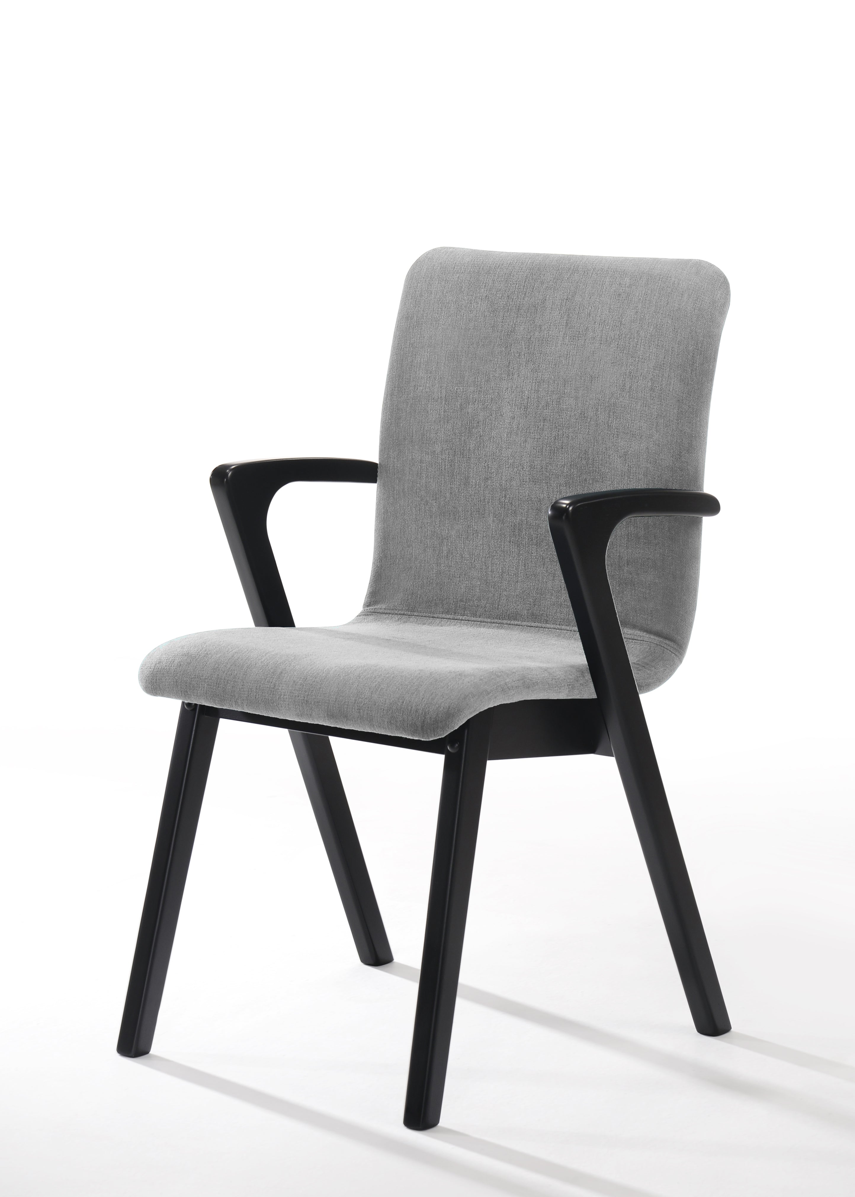 This chair features a beautifully crafted solid wood frame that flows seamlessly into its arm and leg structure, creating a distinctive silhouette that stands apart from conventional designs. The gently curved arms and angled legs add both style and stability, giving the piece a light yet architectural presence.