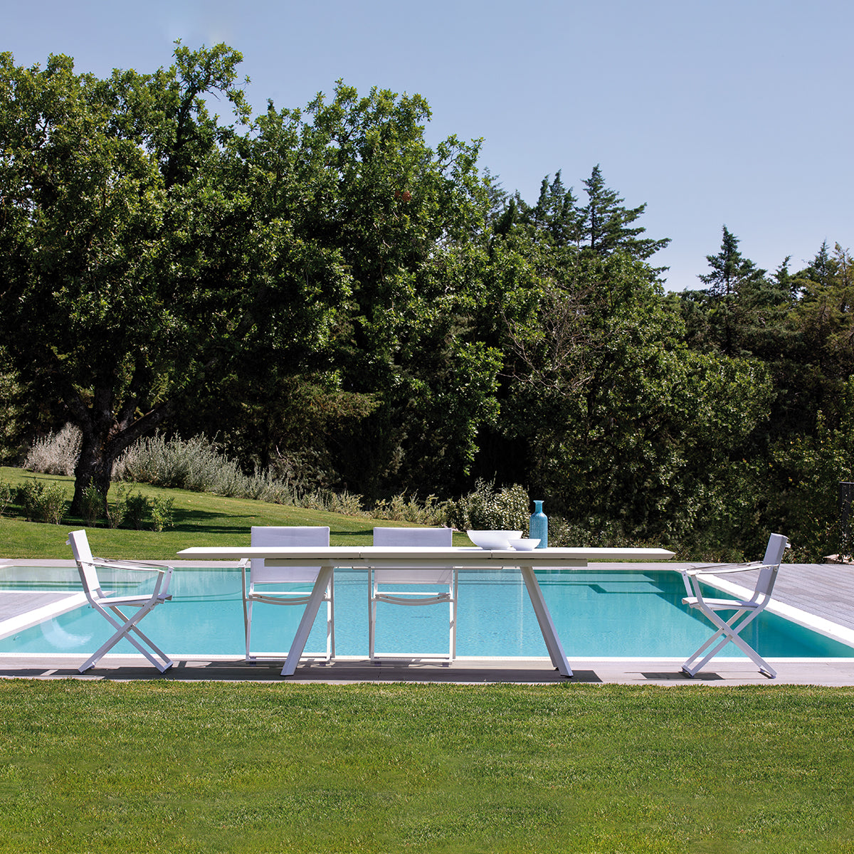 Dasy Extension Dining Table, available in Mud Gray and White. Part of the Italian Garden Collection, this extension dining table features a sleek metal frame design and is crafted from water and UV resistant materials. It's easy to clean, with materials and metals coated in Qualicoat thermosetting powders. Available in Mud Grey or White, the table dimensions are L87/126" x D39" x H30". Enjoy the beautiful view of your patio and relax outdoors by reading books or drinking a cup of coffee at this stylish outdoor dining table.