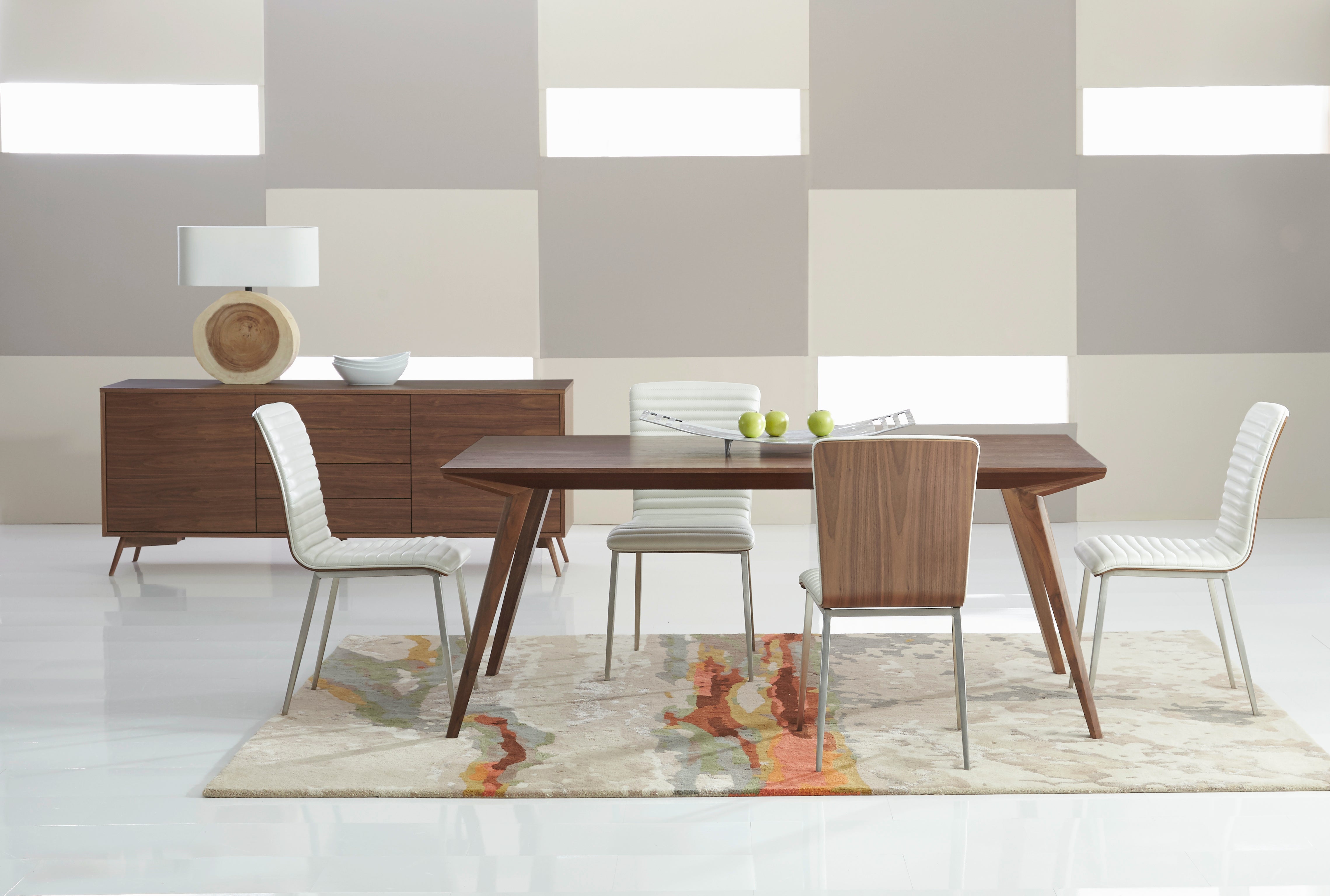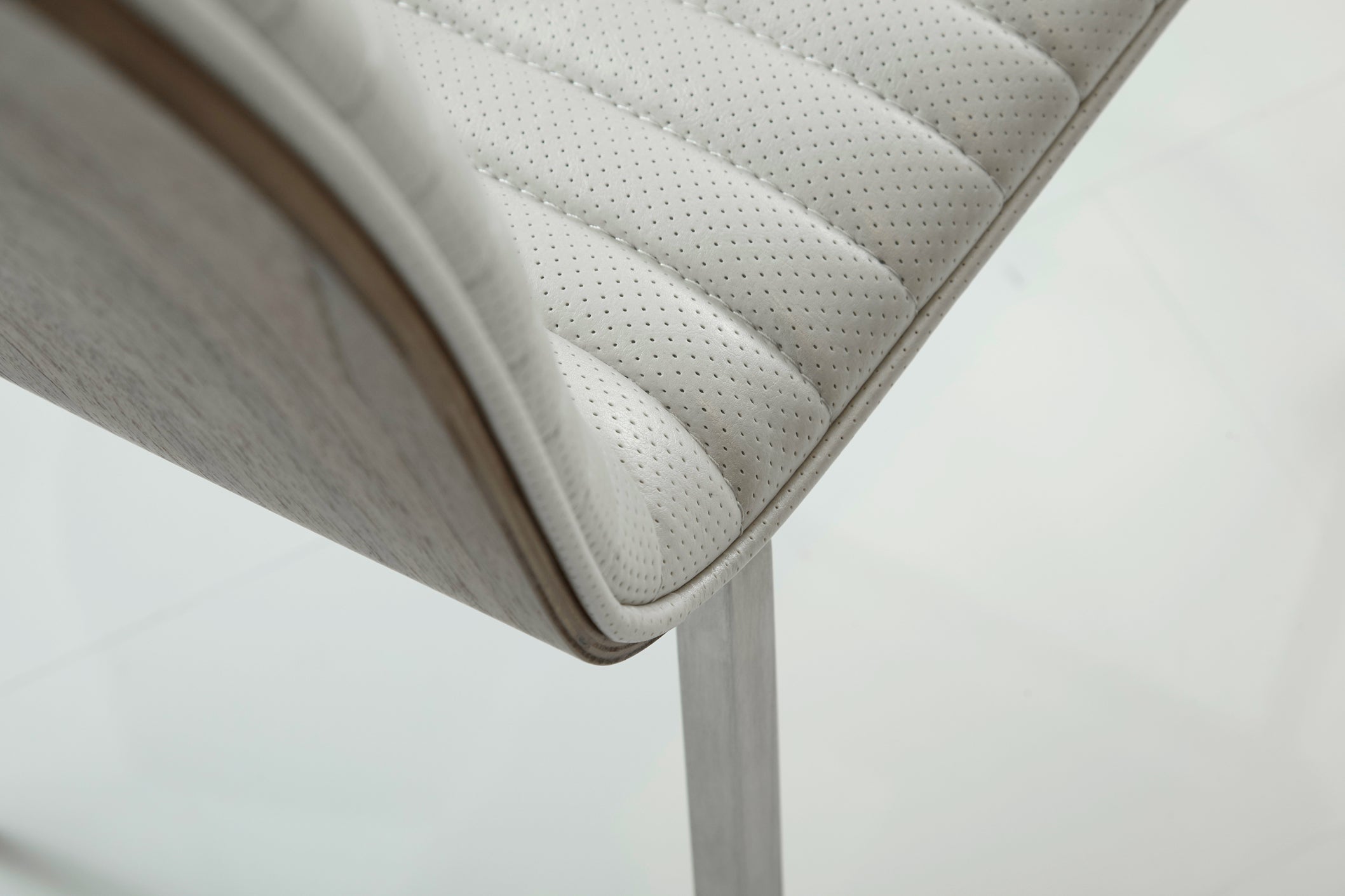 The Fernanada Dining Chair is a sleek and sophisticated dining chair featuring a brushed stainless steel frame, a ruffle-design PU cover seat, and a walnut veneer back.