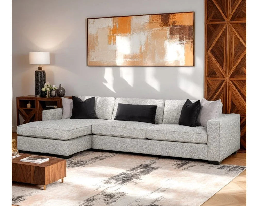 Un divano componibile LHF o RHF composto da una chaise longue e un divano con braccioli con elegante rivestimento in tessuto, materiale antimacchia e anti-rovesciamento (tranne il modello Monet), struttura in legno massello (tutto avvitato e incollato), struttura senza molle, auto-ponte. Incluso con 4 cuscini da lancio e un cuscino per i reni (imbottito in piuma). Dimensioni: L130" x P70" x H34" (si prega di vedere 70 modelli personalizzati e dettagli sulle variazioni di colore sul nostro sito Web)
