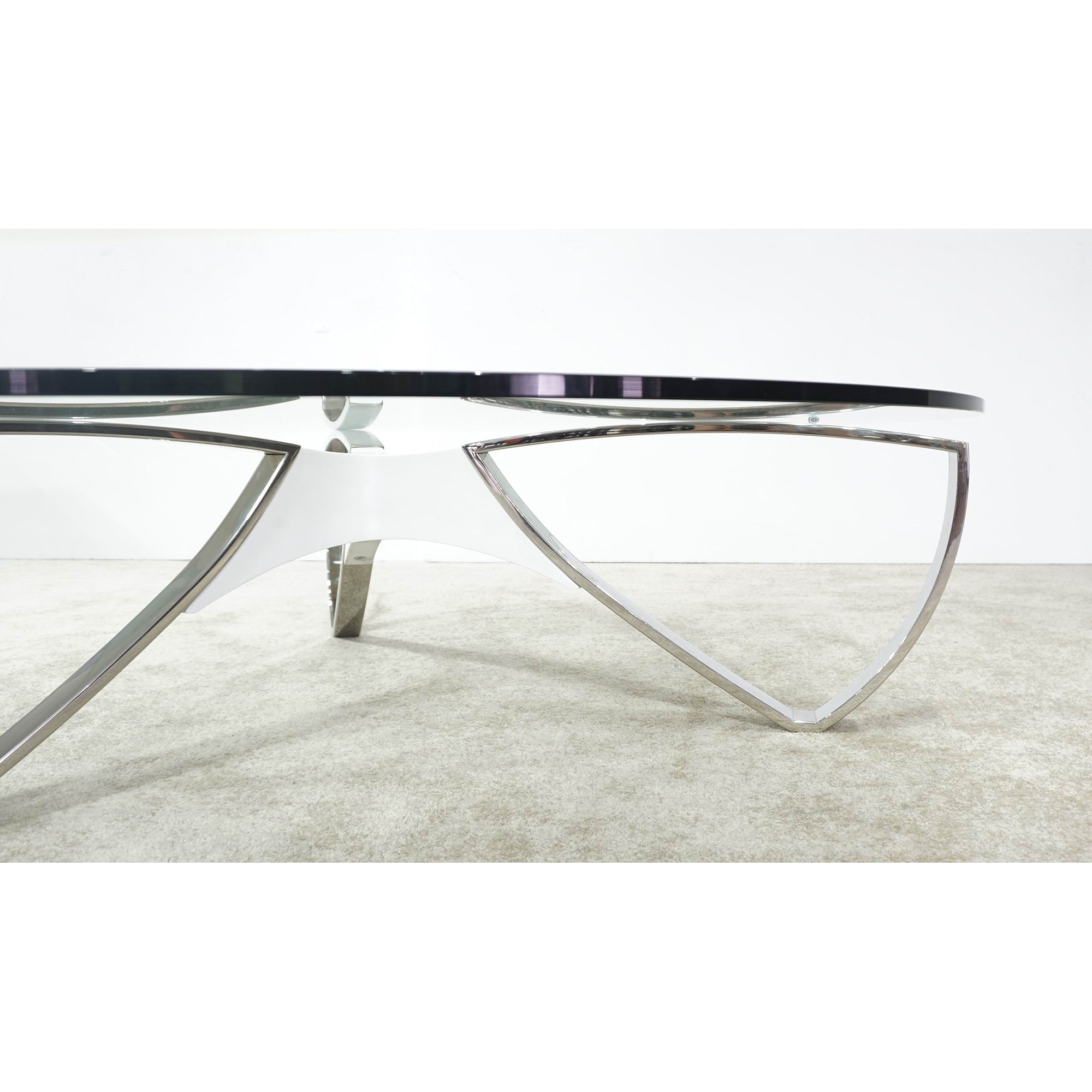 The Jango Coffee Table 44", available in White or Black, is the perfect addition to a contemporary home. Featuring a round glass top and a steel frame.