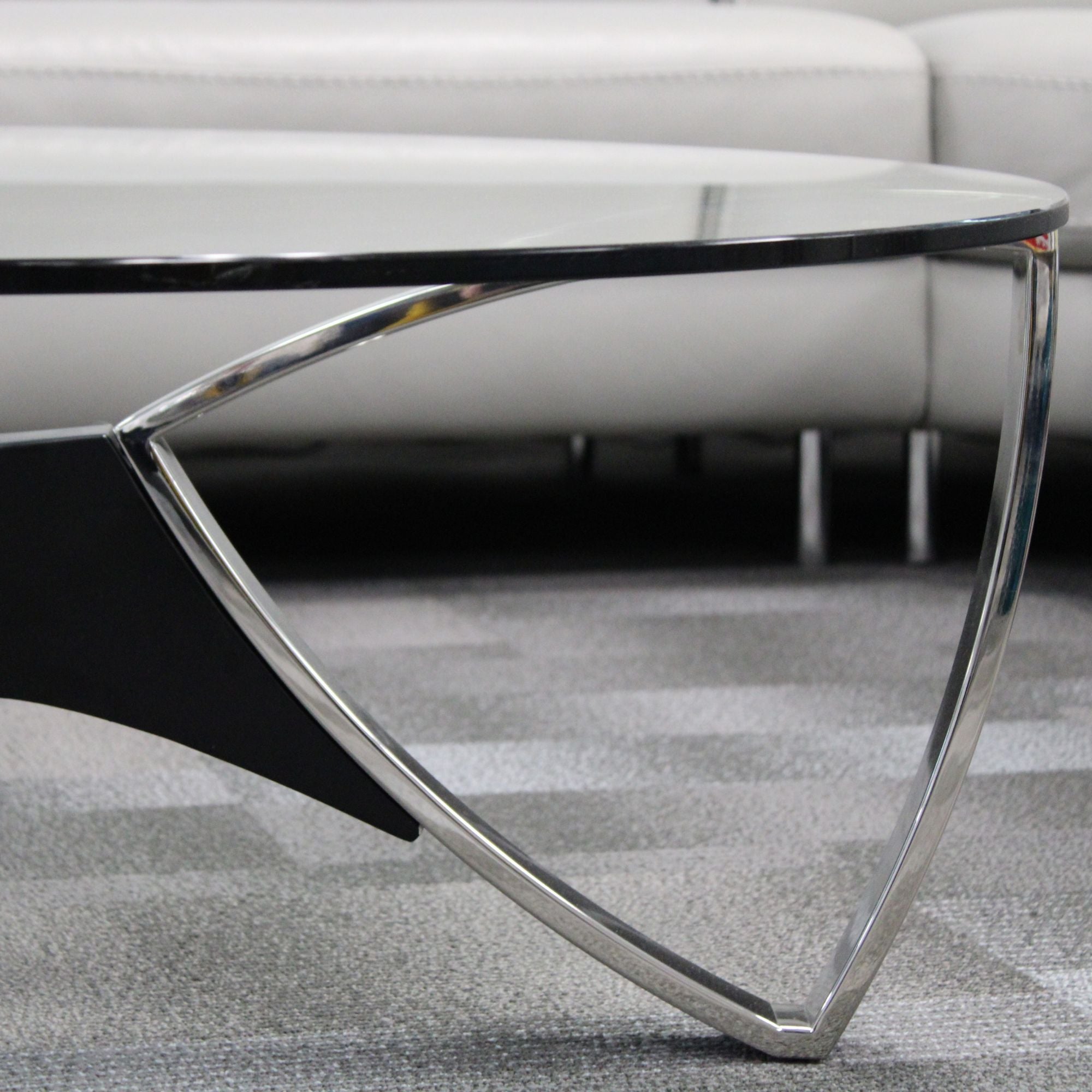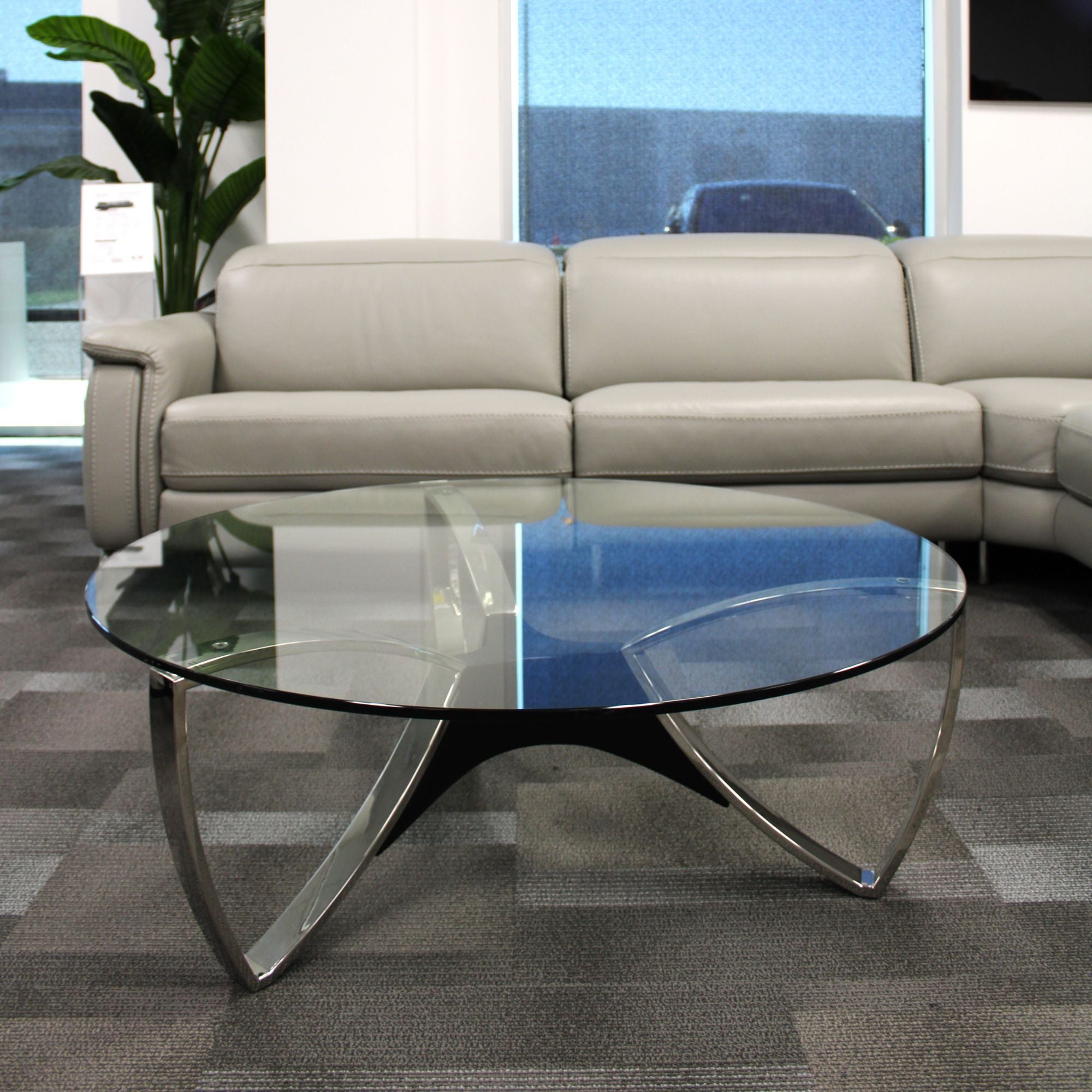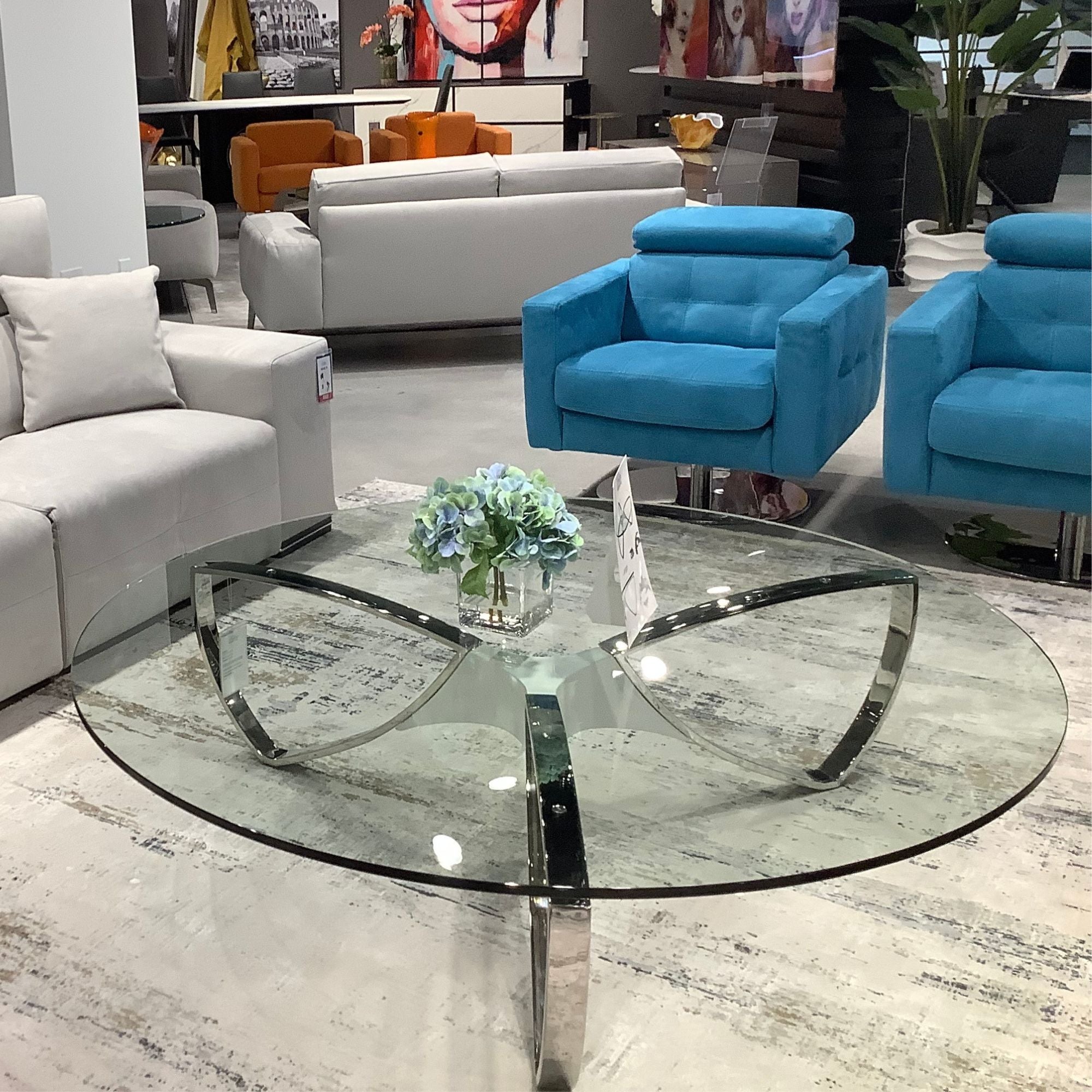 The Jango Coffee Table 60", available in White or Black, is the perfect addition to a contemporary home. Featuring a round glass top and a steel frame.