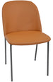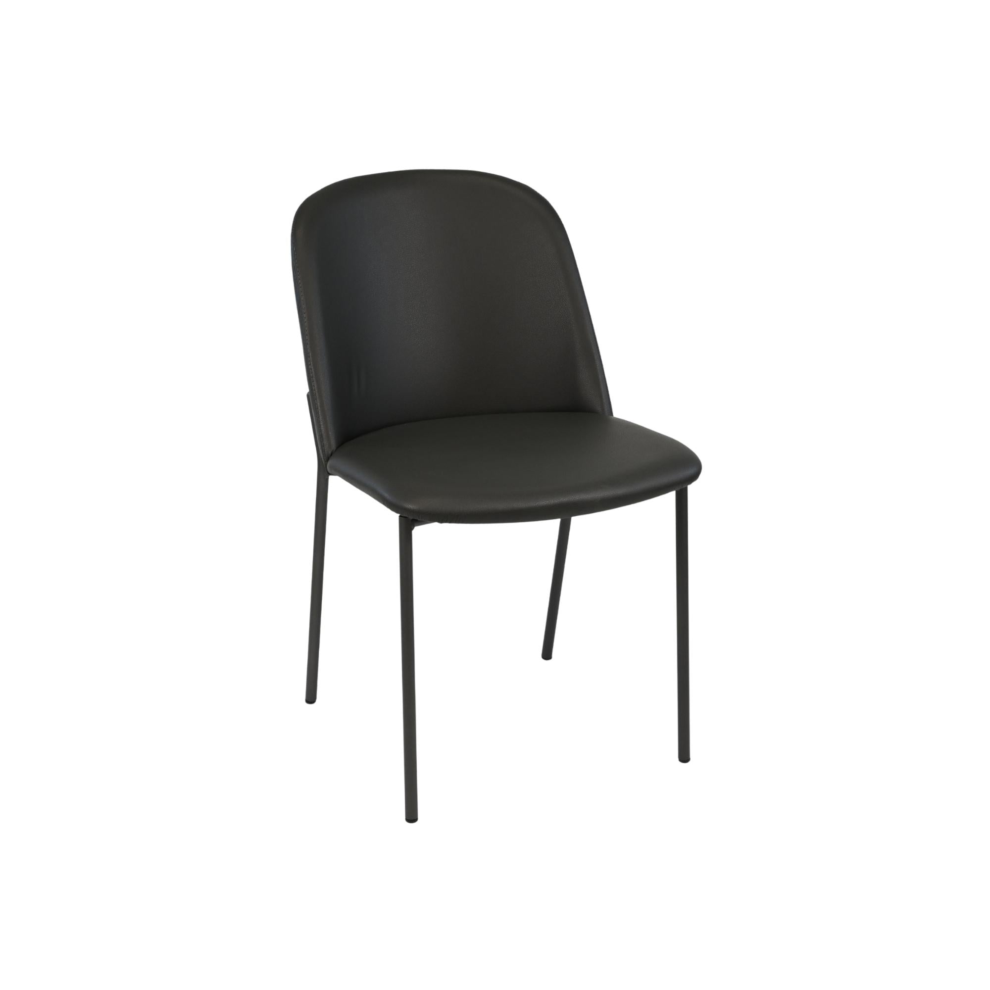 This dining chair showcases a sleek and modern design with a gently curved backrest and seat, providing a comfortable and stylish seating option. Upholstered in smooth leather with matched stitching, it combines durability with an elegant finish.