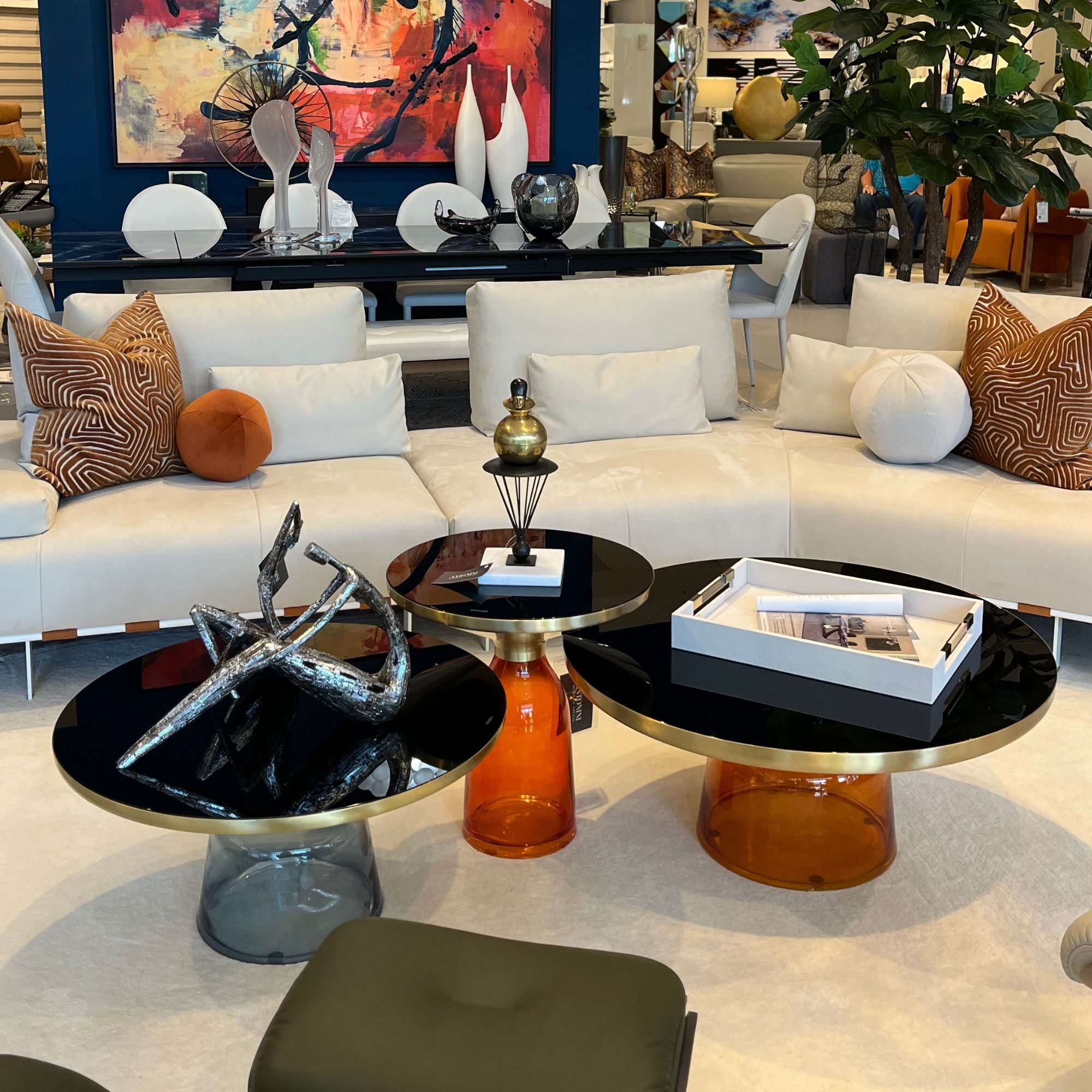Il tavolino Ritz è caratterizzato da un elegante piano in vetro nero e da una sorprendente base in vetro blu, il tutto completato da una struttura in acciaio inossidabile spazzolato color oro.