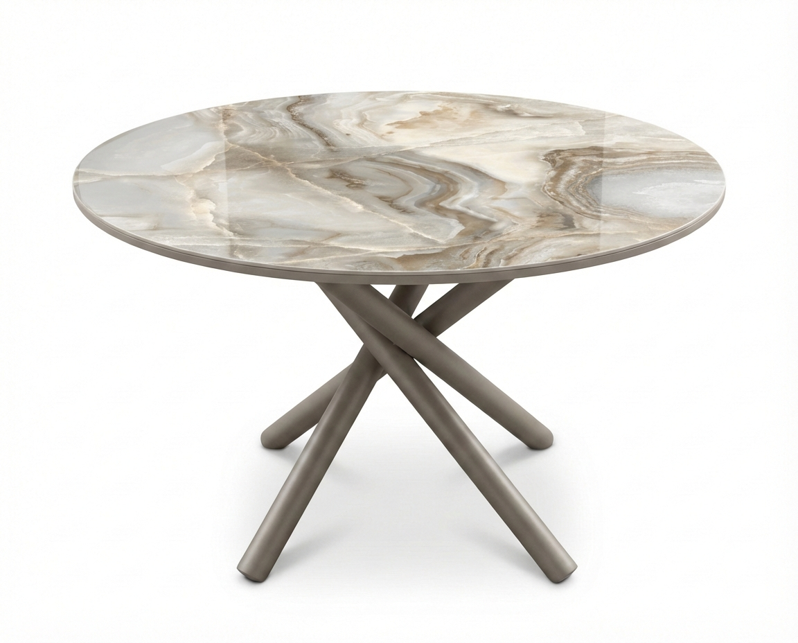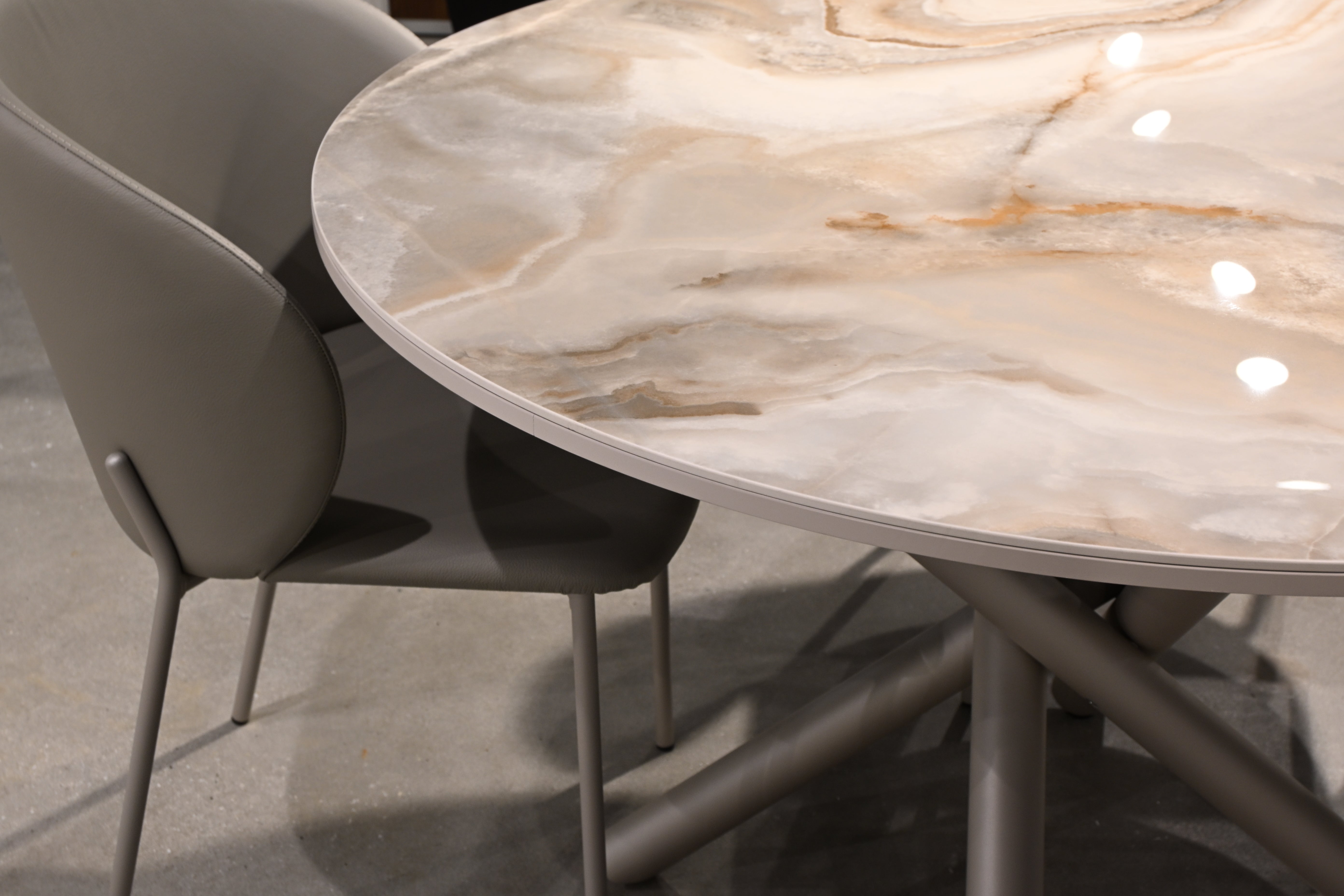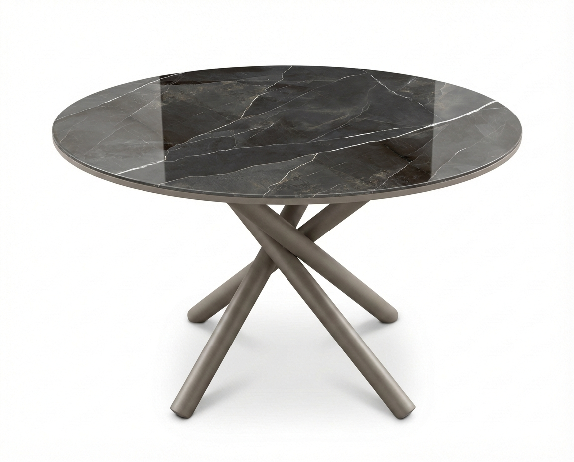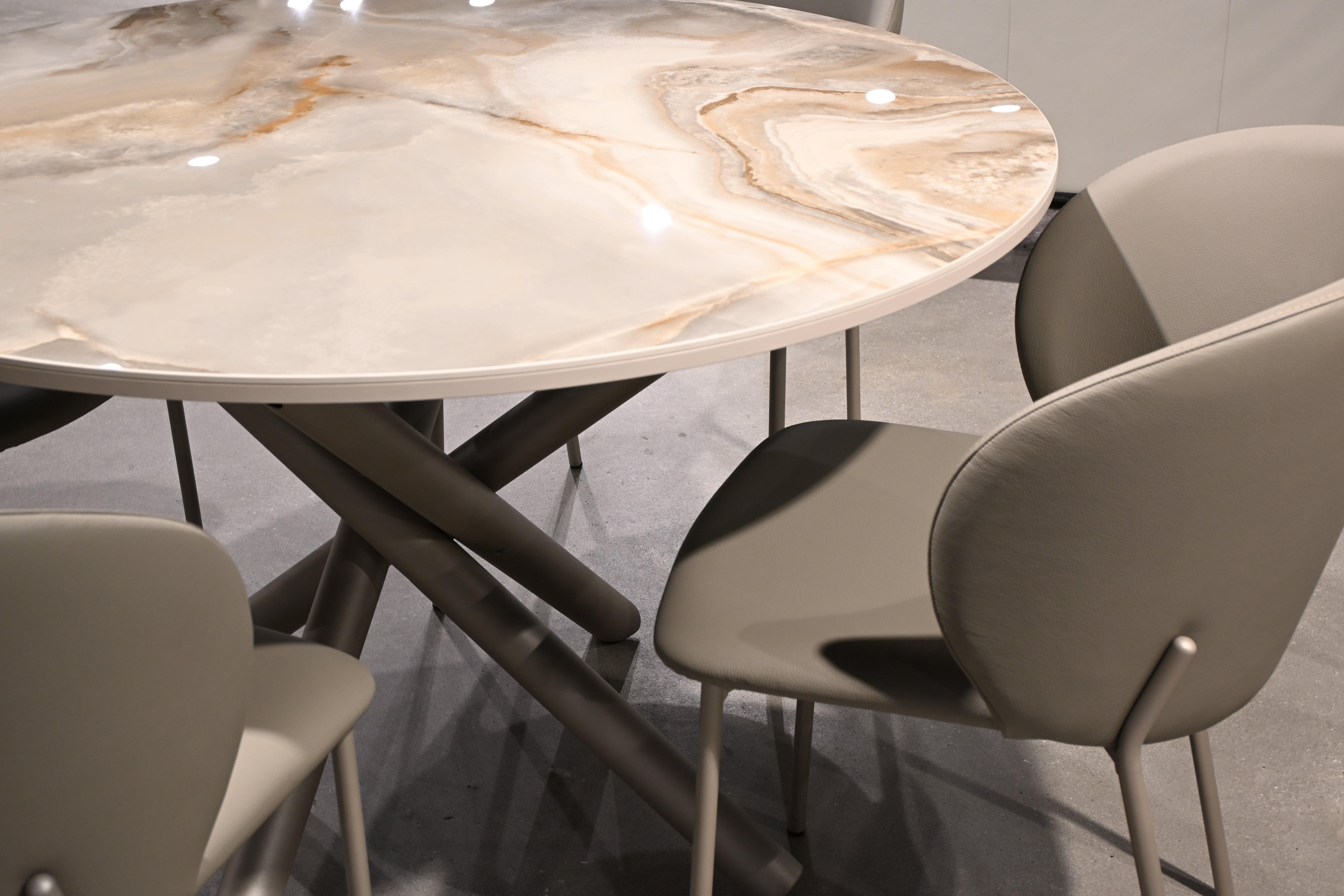 The Umbria Dining Table is a refined choice for smaller dining spaces, offering Italian craftsmanship, thoughtful proportions, and design-forward style. Made in Italy, it features a sculptural base in anthracite or silver with elegantly twisted legs that draw the eye and add subtle architectural character. The table top is offered in four different ceramic finishes (Calacatta Black, Calacatta White Opaco Matte, Onice Beige, Patagonia), giving you the flexibility to choose a surface that enriches your décor with texture, color, or pattern.
