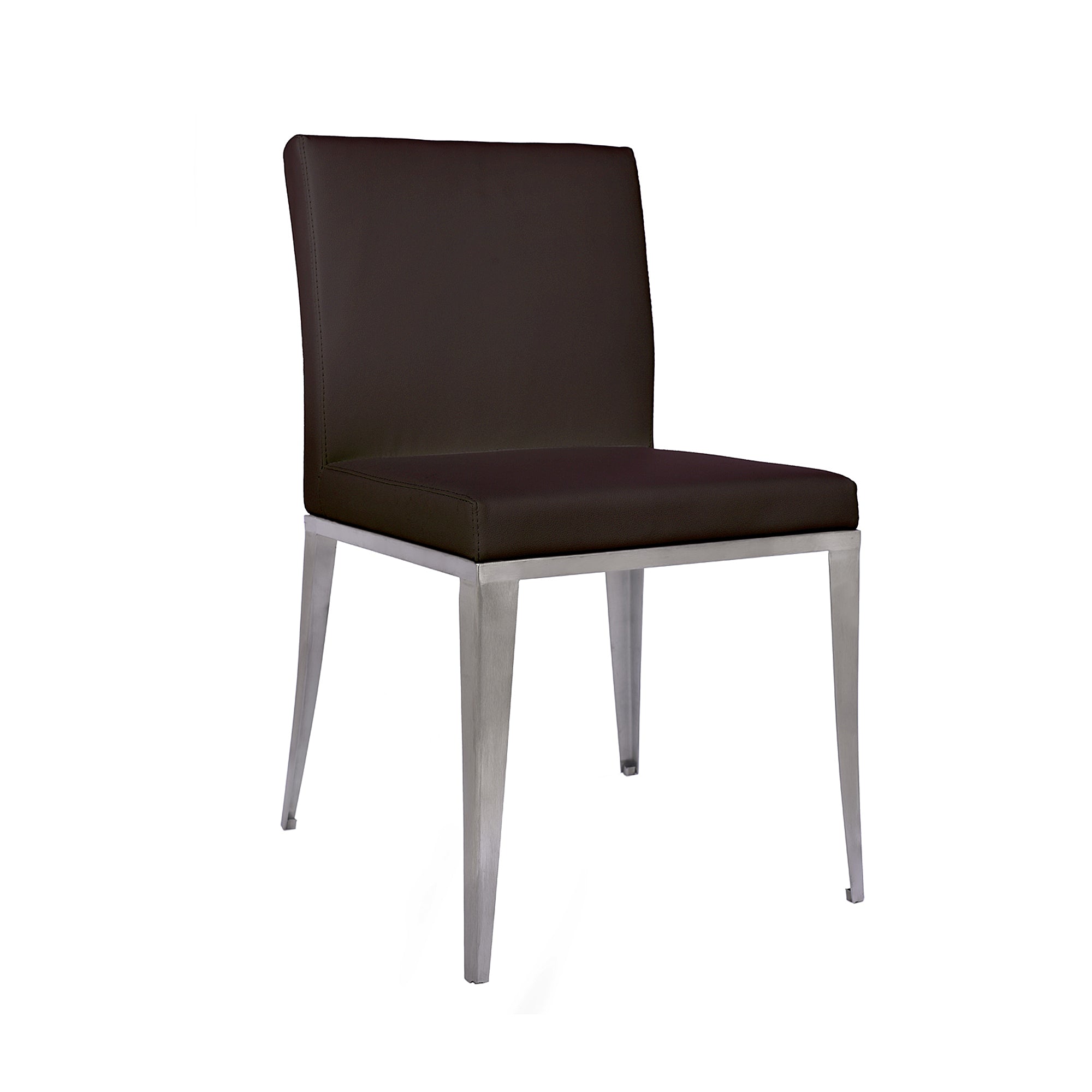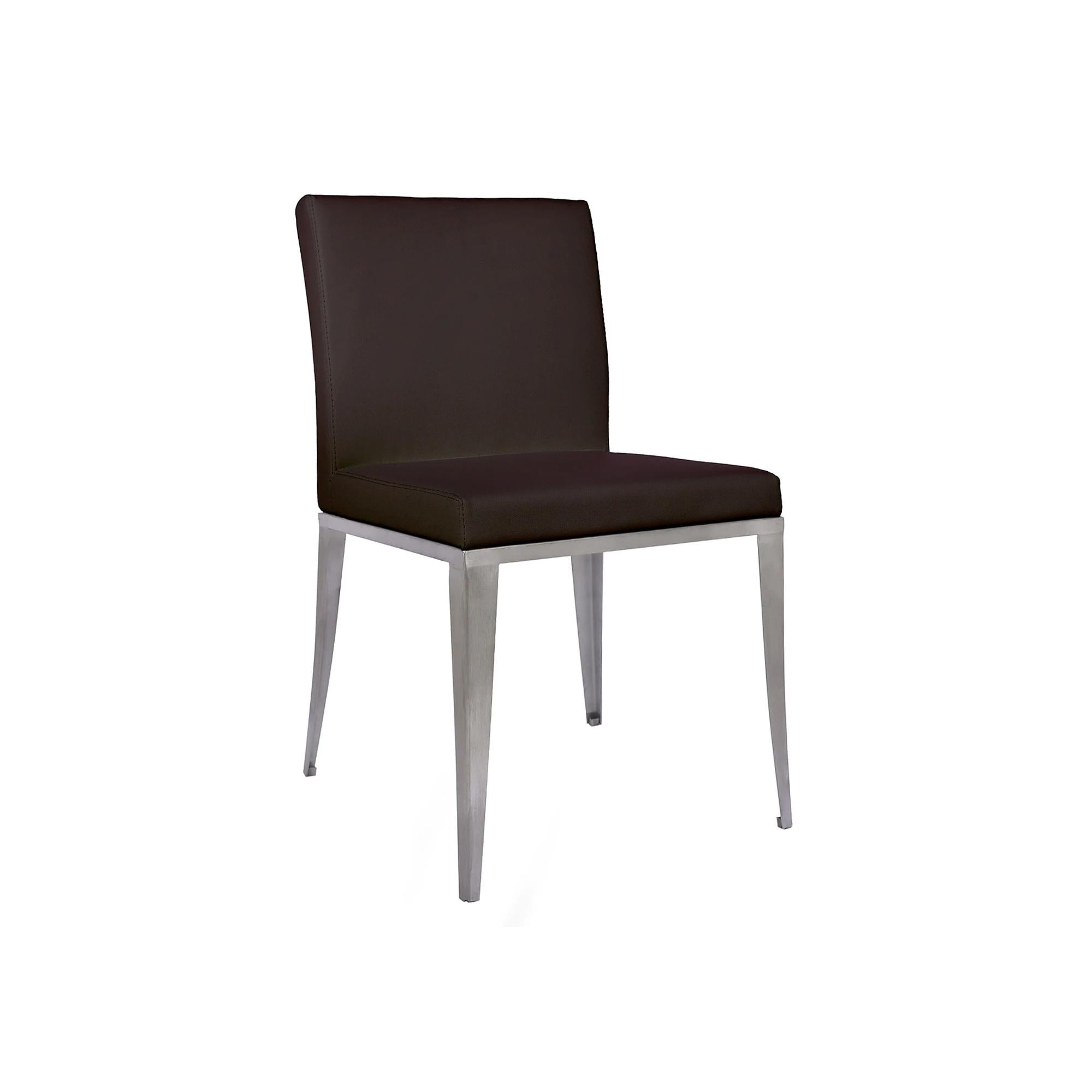 The 1008 Dining Chair in Brown is perfect for both casual dining and elegant dinner parties. It features a high-quality soft brown leatherette seat and back, complemented by a brushed stainless steel frame and legs. Comes in a set of 2 per box.