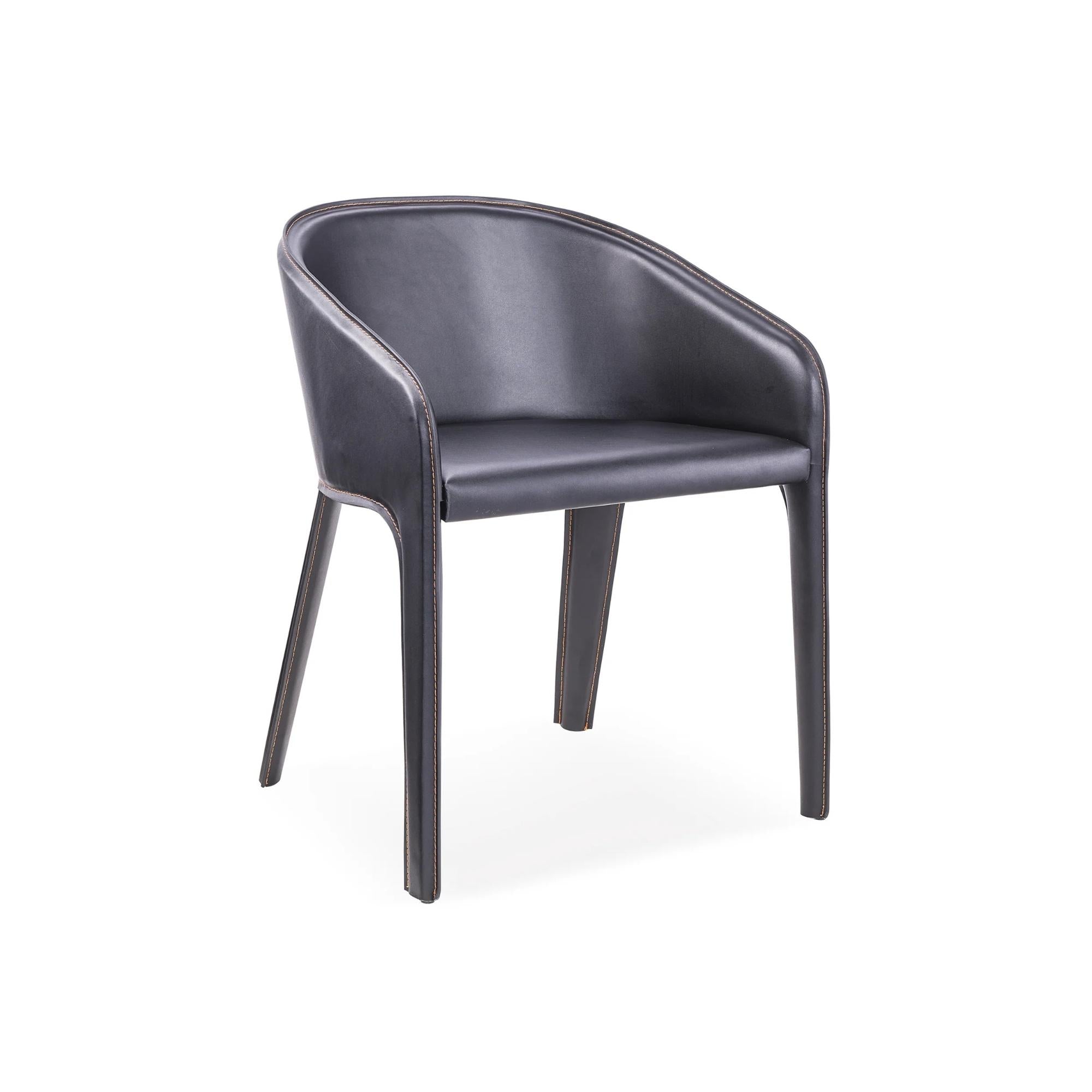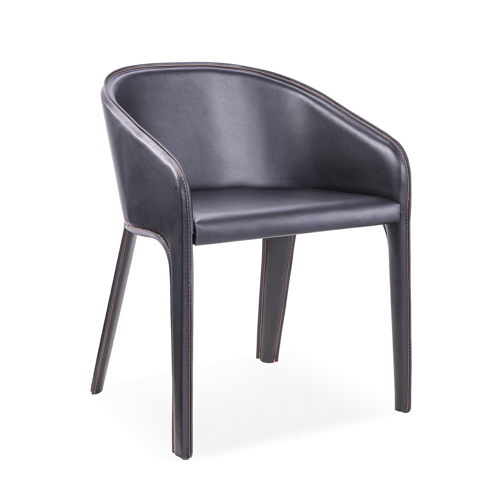 From top to bottom, the Antonia Dining Chair BLACK is beautifully canvased in leather with tailored orange contrast stitches, including the legs. The simple yet elegant look of this chair will complement any desired dining set.
