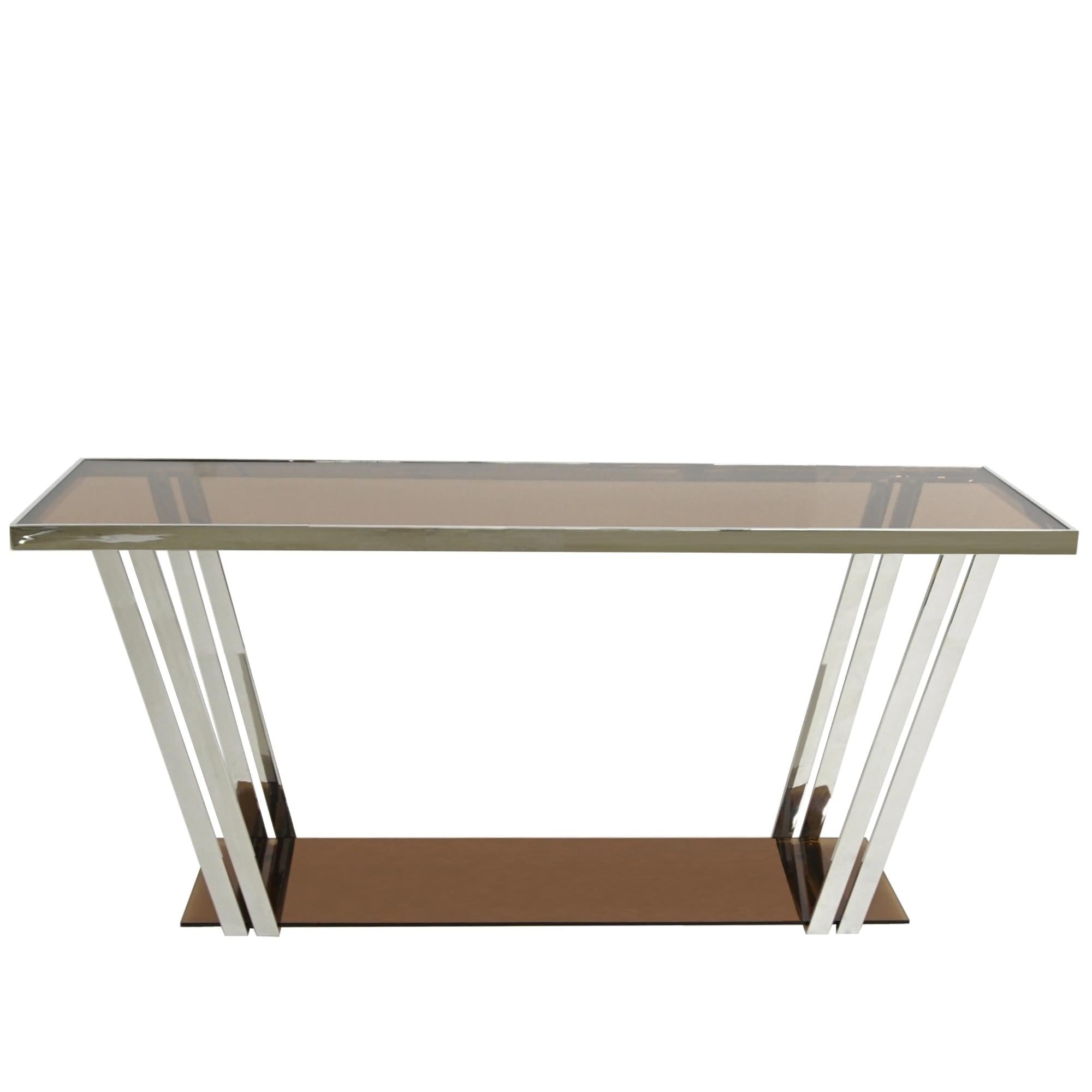 he Carraway Side Table 2 brings rich, moody glamour and sculptural modern design into any living space. Its 8mm brownish-gold glass top and matching lower shelf offer a warm, reflective surface that softly glows under ambient light. A polished stainless steel frame gives the table crisp lines and a refined metallic structure that balances the darker tones of the glass. This side table offers generous length and height, ideal behind a sofa, along a wall, or as a display surface for art, lighting, and décor.