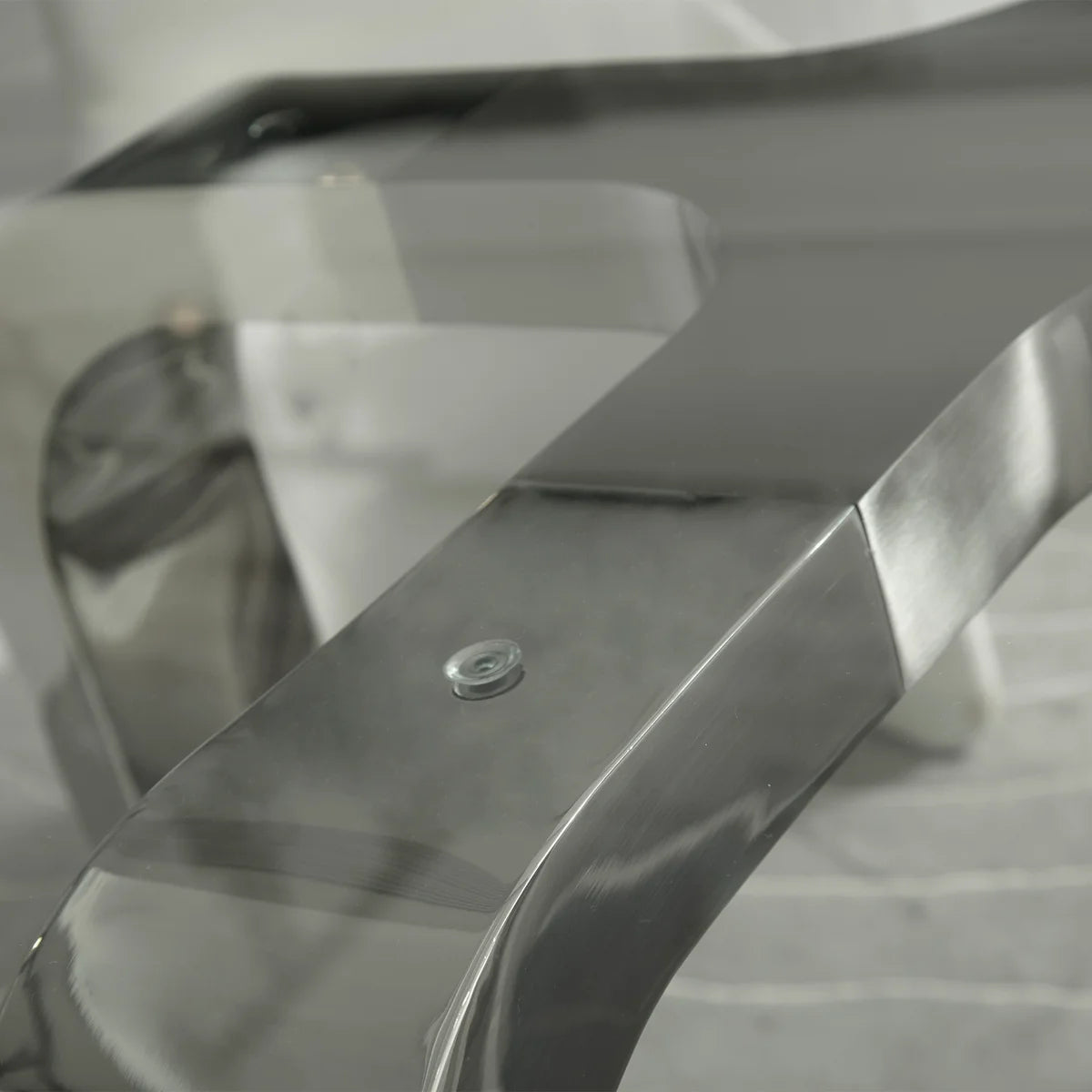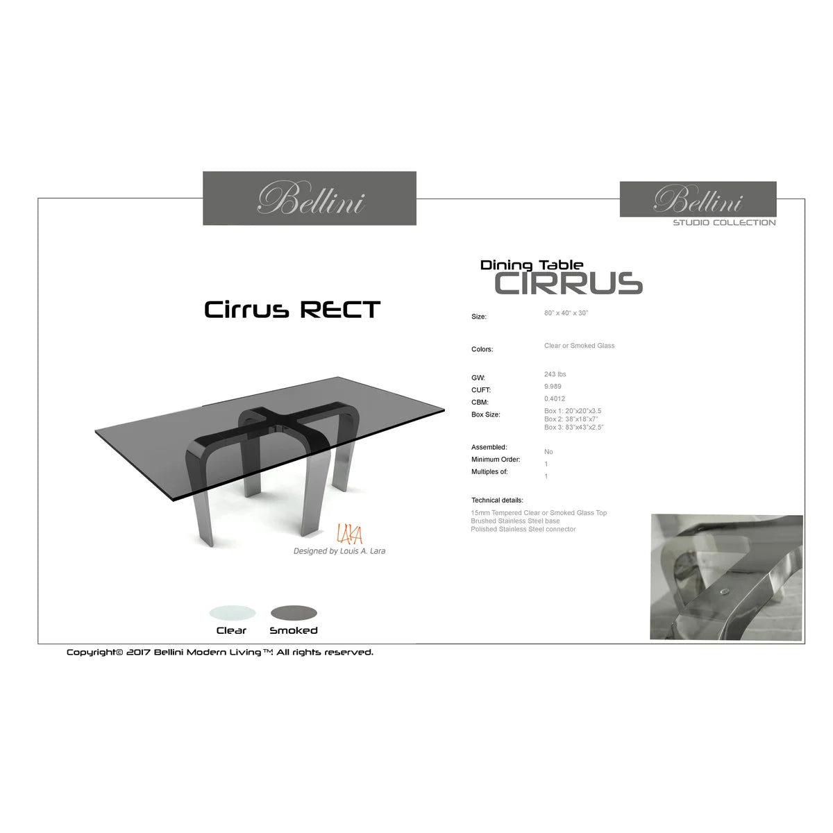 Cirrus Rect Dining Table with smoked Glass. New world glam meets elegant contemporary style with this uniquely designed dining table by Louis Lara. Featuring a combination of brushed steel and mirrored steel finishes, this table serves as the perfect accent piece for your home. Louis A. Lara is renowned for the sculptural quality of his work, with designs featured in design museums and major motion pictures. We are pleased to offer his elegantly designed dining tables, exclusive to Bellini Modern Living.