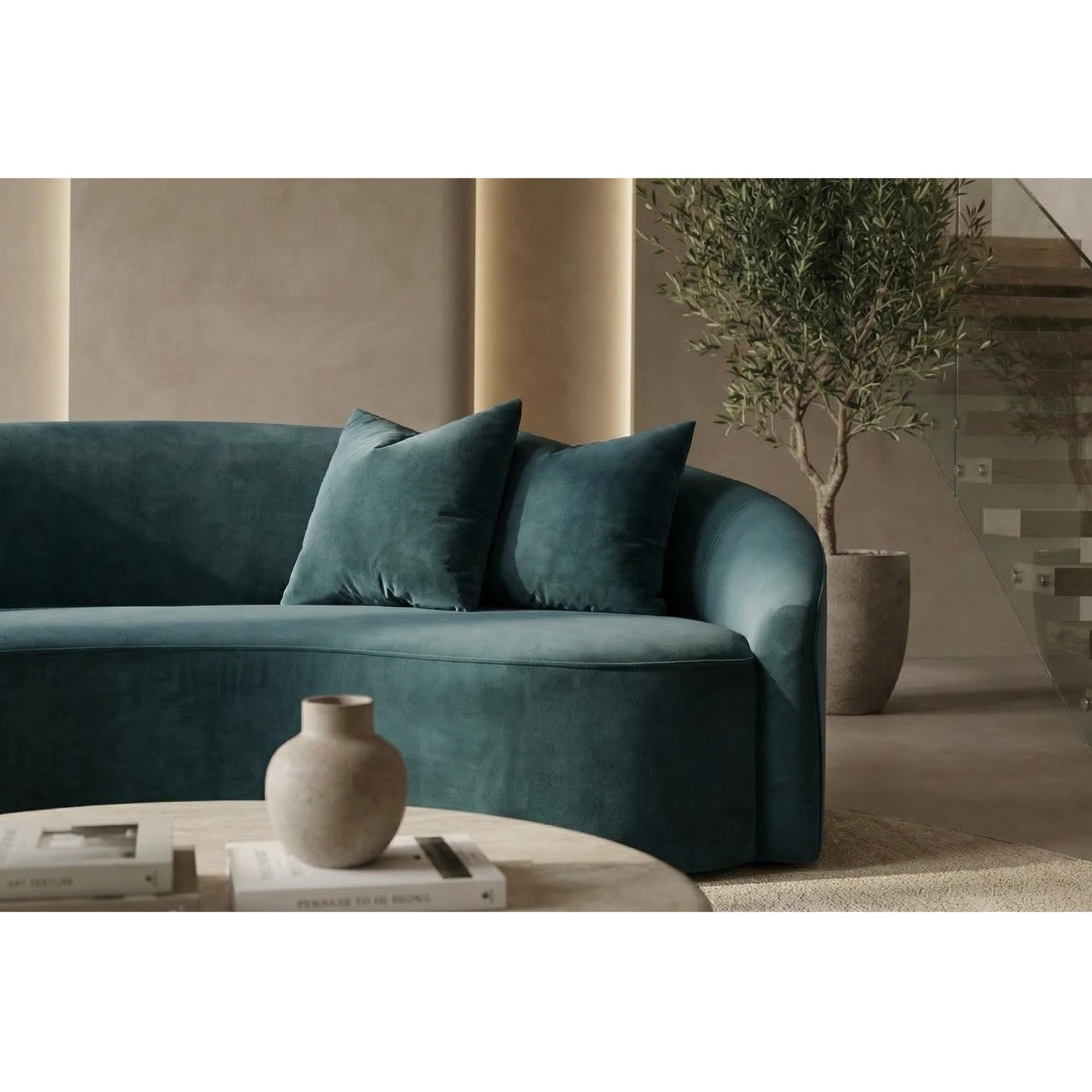 The sofa's solid wood frame, meticulously screwed and glued, provides enduring strength, while no-sag spring construction ensures lasting comfort. Its unique curve shape adds sophistication, creating an inviting space for relaxation. Finished with two down-filled toss pillows, the Fiona Sofa is a modern masterpiece, offering luxurious comfort and standout visual style that’s sure to captivate. All measurements are approximate due to the handmade nature of the item.