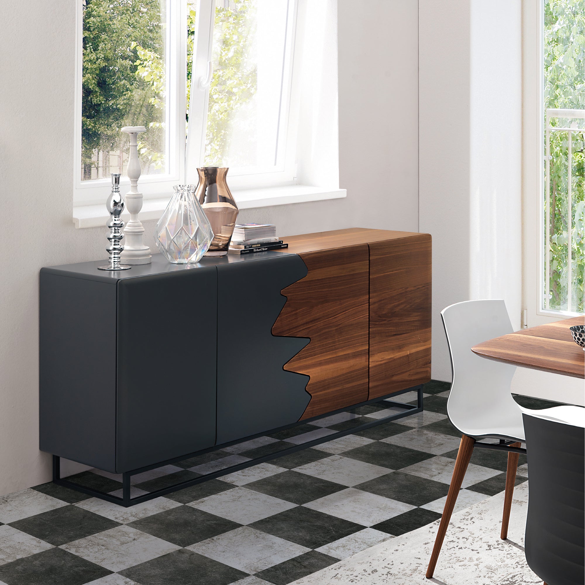The Kali Sideboard is available in Walnut/Iron, Gray/Walnut, and Gray/Ash. This sideboard features a unique design and texture that adds contemporary flair and character to any room.
