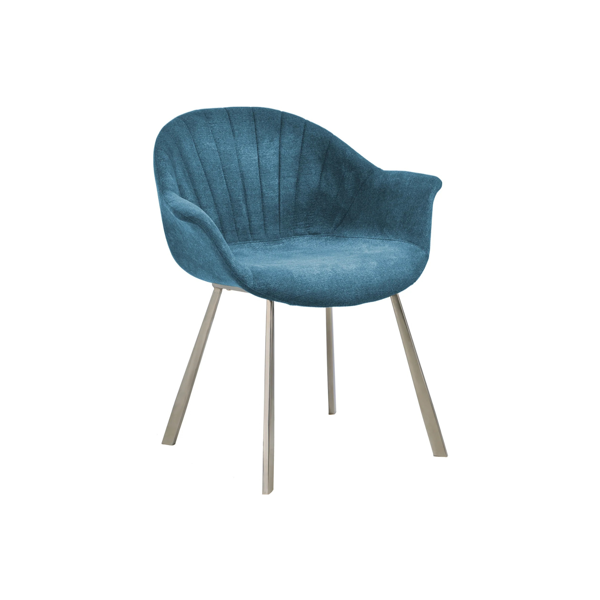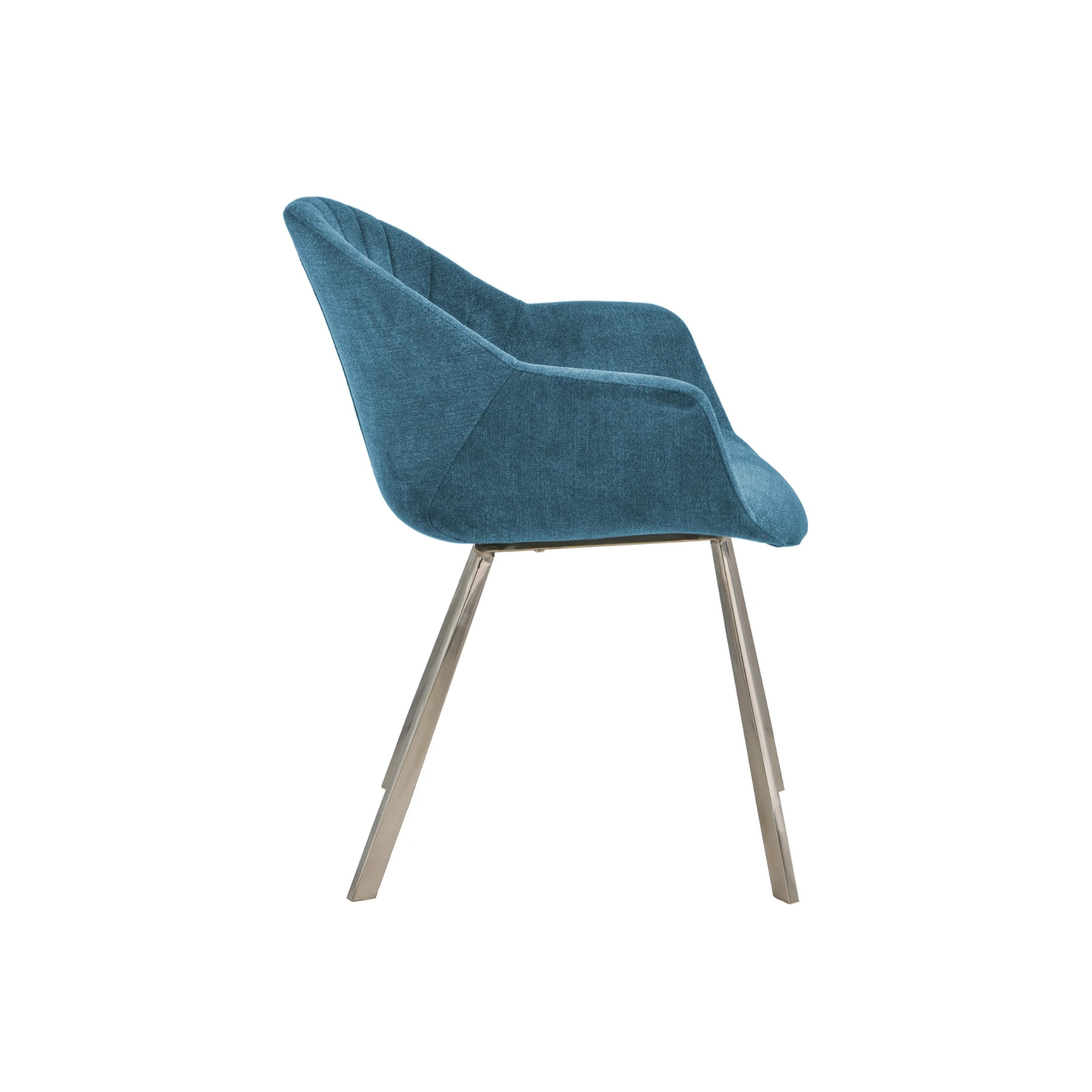 The Natalie Arm Chair Dining Chair Blue features a sleek design with a blue soft fabric cover and a chrome frame, perfect for adding a touch of elegance to your dining space.